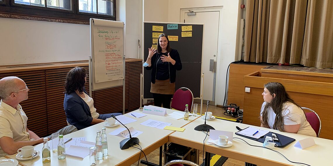 Das Konzept der Zukunftswerkstätten ist auf Offenheit und Kommunikation auf Augenhöhe ausgerichtet. Die Teilnehmenden fanden sich in Kleingruppen zusammen und diskutierten in einer Kritik-, einer Fantasie- und einer Umsetzungsphase zum Konzept der Integrationsmesse. Die Teilnehmenden führten ihre Wünsche und Ideen in ein realistischeres Konzept über - eine starke Leistung im Teamverband!
