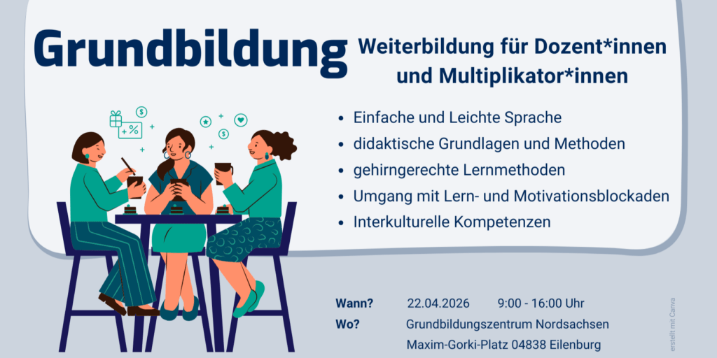In dieser Schulung werden zentrale Kompetenzen für die Vermittlung von Grundbildung vermittelt, gemeinsam reflektiert und praxisnah erprobt.